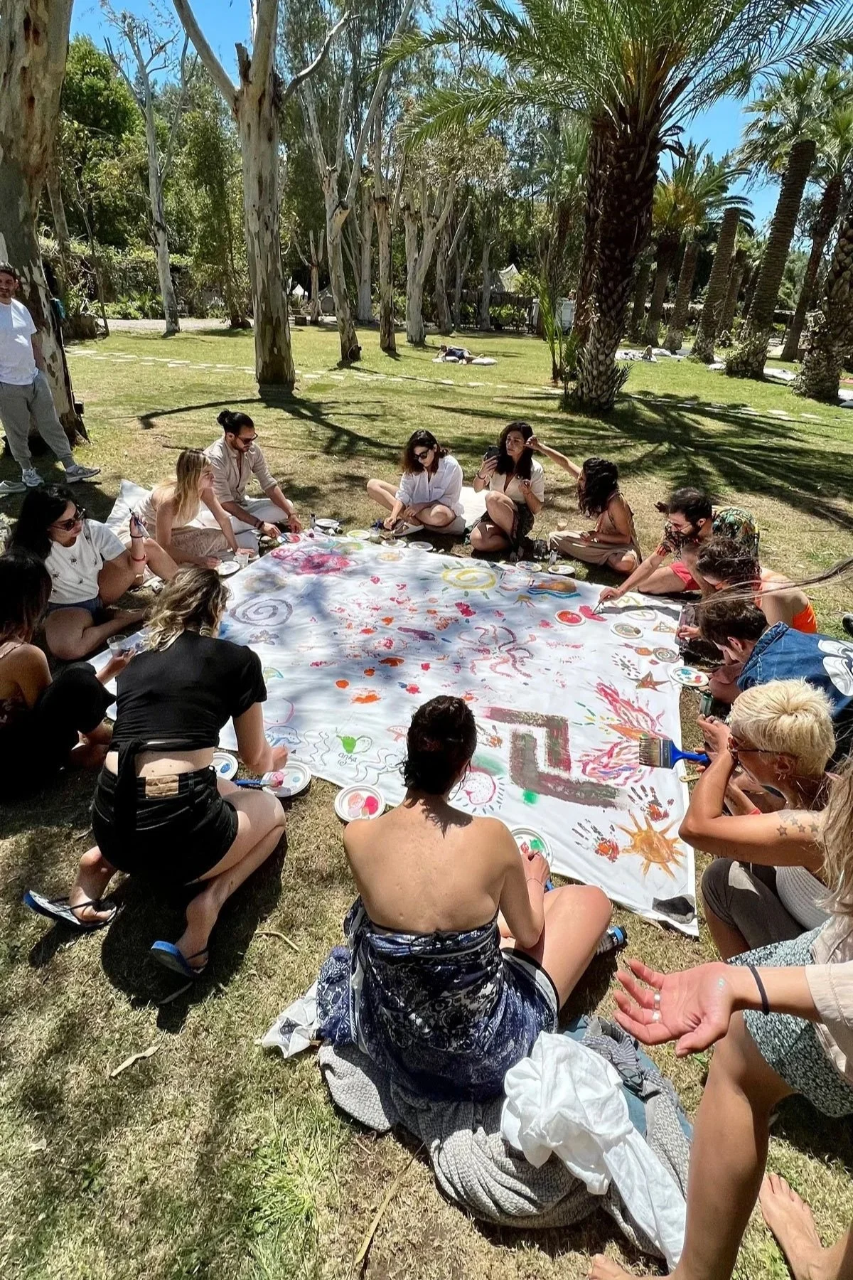 co-workers, or even strangers? That's the essence of Collective Art Painting - a relaxed and welcoming art experience where everyone chimes in to create something great. You don't need to be an expert; just bring your enthusiasm. It's perfect for team building, collaboration, fun, and has a truly meditative effect. Participants are invited to co-create a large scale painting. It can be indoors, outdoors or even online. I will guide you through, and before you know it, you'll have a collaborative large-scale masterpiece. It is an emotional journey on canvas. This experience is also perfectly suitable for companies looking for engaging team exercises.